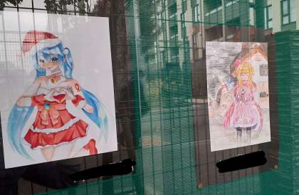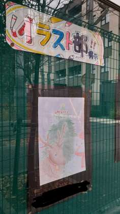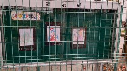 校門横の掲示板は、イラスト部による、クリスマスの作品に入れ替えをしています。