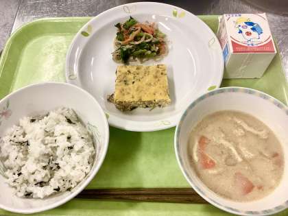 今年の給食も残すところ、あと10回です!先週は残菜が少ない日が続きました。このまま給食をしっかり食べて、最後まで元気に学校生活をおくってほしいです。今日は「わかめご飯」、ひき肉・野菜・椎茸・しらすなどが入った「五目卵焼き」、「野菜のごま和え」、大豆と豆乳の入った「呉汁」です。