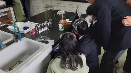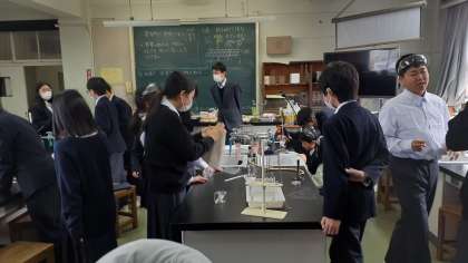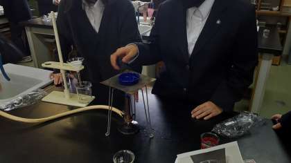 今日の1年生の理科は実験です。班に分かれて「溶質を取り出す」実験をしています。