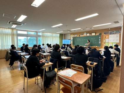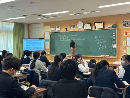 3年生の社会科は、司法制度について学習しています。モニターと黒板を使って授業しています。
