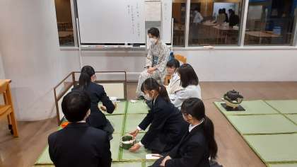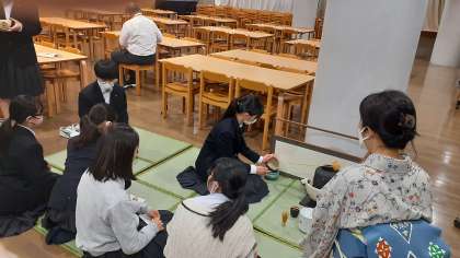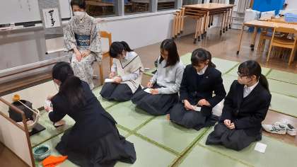 12月12日(火)に、日本文化部では、今年最後の講師の先生をお招きしての表千家の茶道のお手前の練習をしました。お茶菓子には、寒椿や柚子などの季節の練り切りをいただきました。
