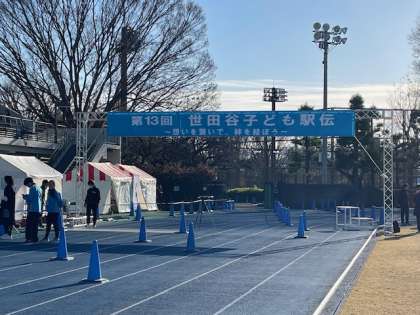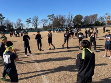12月17日大蔵総合競技場で開催の世田谷子ども駅伝会場です。砧の学び舎の選手たちがアップ中です。