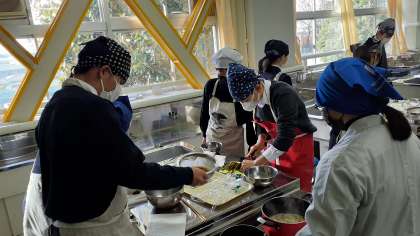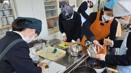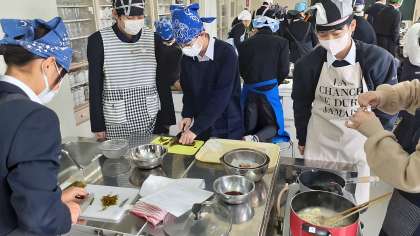 2年生の家庭科は調理実習です。メニューはキノコ汁と昆布と鰹節の佃煮です。