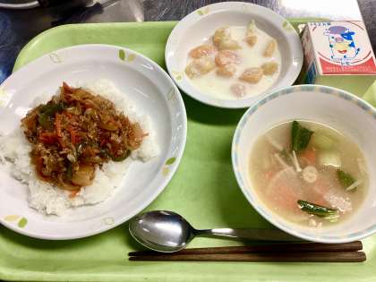 長かった2学期も、来週の終業式でついに終わりになります。実質、今週が「最後の週」と言っていいでしょう。そんな週の始まりは、大人気の「豚キムチ丼」にしました!「人気のこのメニューなら、みんなが明るい気持ちで元気に学校に来てくれるはず!」と思って、おそらく献立に入れたと思います。