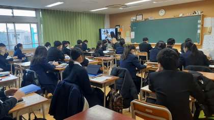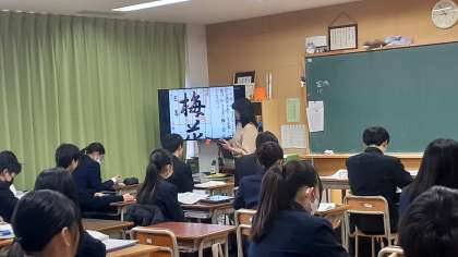 3年生の国語では、モニターを使って、書き初めの課題文字の説明をしています。課題文字は「梅花香る里」と「不断の努力」です。