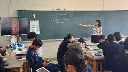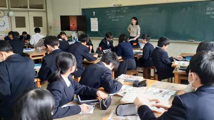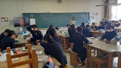 2年生の美術では、浮世絵の歴史や作品について学習しています。浮世絵パロディ作品を制作する前に浮世絵の作品をモニターと黒板を使って説明しています。