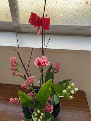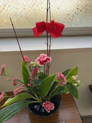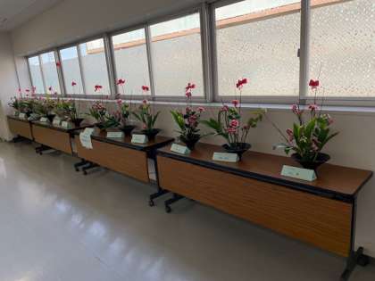 廊下には日本文化部の生花が展示されています。赤いリボンの装飾はクリスマスを表現しているのかな…。