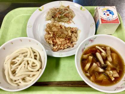 かき揚げは、玉ねぎ・人参・いかを具に作ったシンプルな物です。しかし、人の手作業でないと作れない料理なので、とても手間がかかります。作ってから時間を置いてしまうと、ベチャッとして形が崩れてしまうため、揚げる前に50個ずつほど作ってもらい、油に入れたらもう50個作るという丁寧な方法で進めてもらっています。そのため、うちのかき揚げはとても美味しいです。今日も調理員さん、ありがとうございます。
