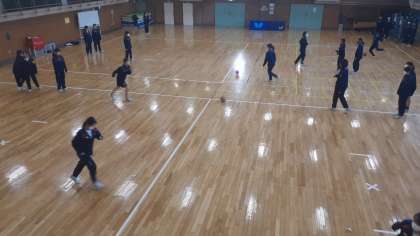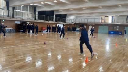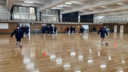 2年生体育の女子は、格技室でフットサルをしています。グループに分かれて、ドリブルからのパスの練習をしています。
