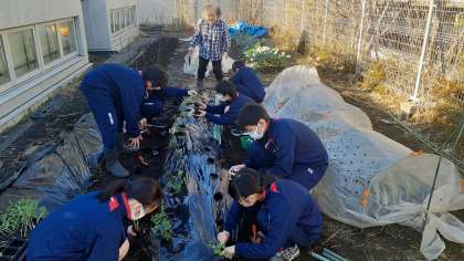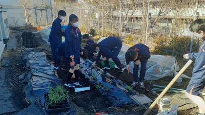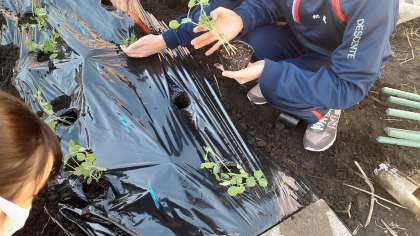 今日の昼休みに、農業部ではスナップエンドウの苗を植える作業をしています。甘いスナップエンドウの収穫が楽しみです。