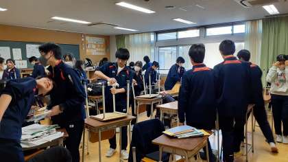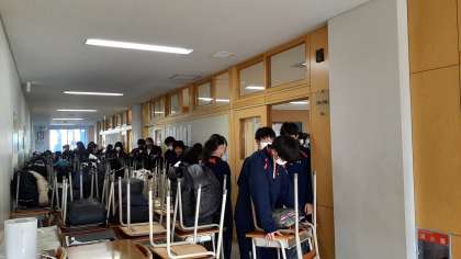 今日の6時間目は、美化デーです。まず、椅子の足を拭いて、机椅子を廊下に出します。3年生の清掃の様子です。