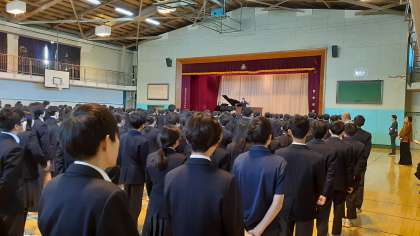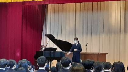 校長先生のお話のあとは、校歌斉唱です。生徒代表の指揮、伴奏で歌います。