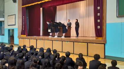 まず、「中学生の税についての作文コンテスト」で優秀賞、並びに世田谷税務署一日税務署長となった生徒の表彰です。