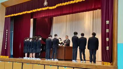 続いてバドミントン部です。世田谷区の秋季新人大会と冬季個人大会の表彰があります。新人大会では、男子団体五位、女子団体二位、男子ダブルス五位、男子シングルス三位、女子ダブルス五位の表彰がありました。冬季大会では、女子ダブルス、男子ダブルスともに五位の表彰がありました。