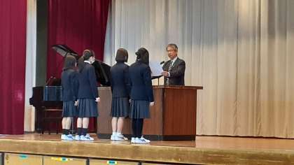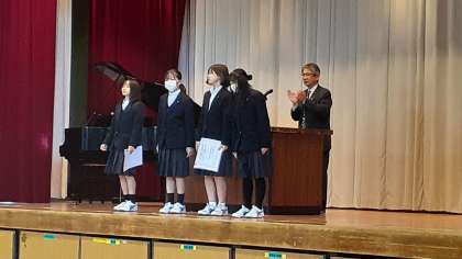 次に剣道部の表彰です。世田谷区新人大会で、女子団体優勝、女子個人三位となり、表彰されました。