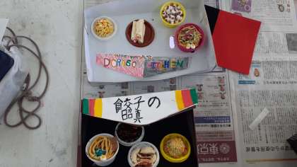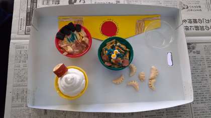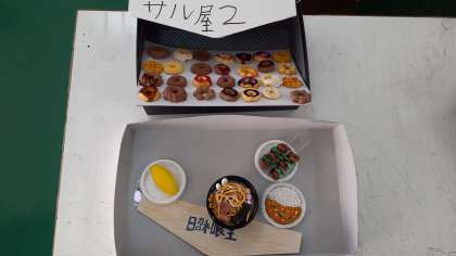 I組の美術では、樹脂粘土と絵の具、グラスデコを使って、ミニチュアの食べ物のお店づくりをしています。中華屋さんやドーナツ屋さん、昭和レトロな食堂など、工夫を凝らした作品がたくさんありました。