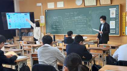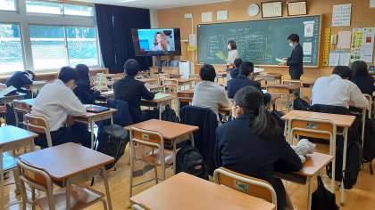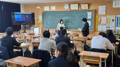 I組の英語では、映像を見ながら、ズートピアのトライ・エブリシングをみんなで歌っています。次にビンゴをするところです。まずはビンゴに出てくる単語をALTの先生と一緒に練習しています。