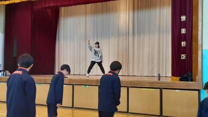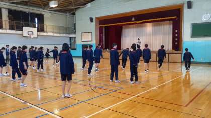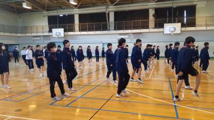 一年生の体育は今日より毎週一回、ダンスの講師の先生による授業をしていきます。男女一緒に習っています。今日はボックスステップやポップコーンステップなどのステップを練習しています。