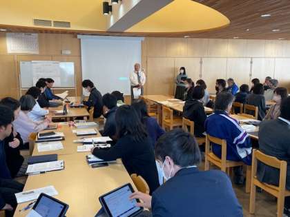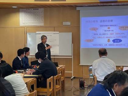 1月17日、道徳公開授業後の協議会では各学年の道徳担当より授業のねらい等の説明と本校の加藤校長先生を講師にお招きし道徳についての講演を頂きました。