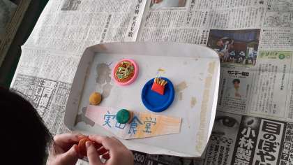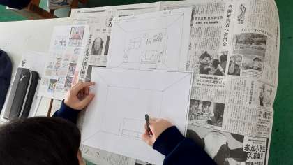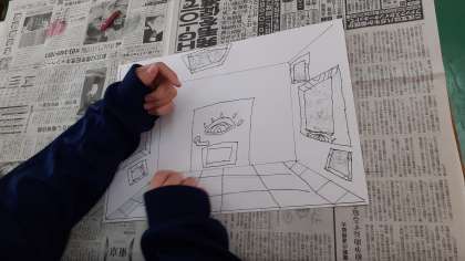 I組の美術では、「ミニチュアフードのお店づくり」に続いて、「100階だてのいえを、デザインする」を制作しています。思い思いの部屋を立体的に奥行きのある絵に仕上げていきます。