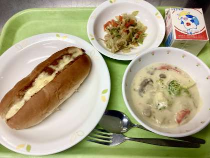 実際、ブロッコリーにかかる手間は野菜の中でも特に多く、今日は他にもパンの成型作業、キャベツやじゃが芋など包丁で切らなくてはならない野菜の存在などもあり、作業量はとても多かったです。それでも、いつも通りの時間に生徒たちの元に届けられました。その代わり、洗い物がたまってしまい、13時過ぎまで調理員さんたちは片付けをしておりました。本当にありがとうございました(泣)