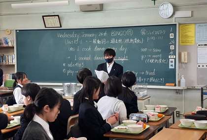 今日より1月30日まで全国学校給食週間です。戦後、中断されていた給食が、無事に再開されたことを祝う記念の日です。給食委員が今日の給食の由来や思いを綴った手紙を読んでいます。