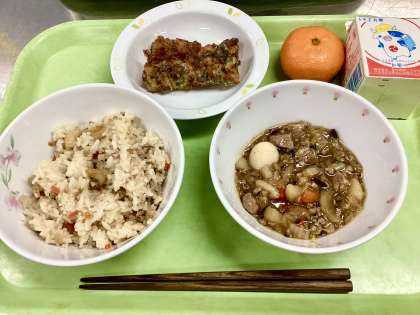 給食では子どもたちが食べやすいように、少し調整を加えています。お米は油・酒・醤油・塩を加えて炊飯しています。あまり多くは入れていないので、お米の味を消してしまうことはなく、ほんのりと薄く醤油の色がついている程度です。具は豚ひき肉・油揚げ・人参・そしてアサリです。アサリが苦手な人でも、肉と油揚げのしっかりした味とコクがあり、アサリの味だけが目立っているわけではないので、食べやすいと思います。アサリは一度下茹でした後に、生姜と酒で漬け込んで、生臭さをなくしています。具にはカツオダシも加えて炒め煮しているので、さらに和風の香りとうま味がプラスされています。