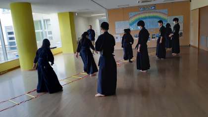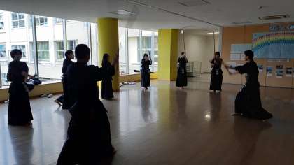 今日の剣道部は、多目的ホールで練習をしています。アップのあと、天井に気を付けながら、素振りの練習をしています。