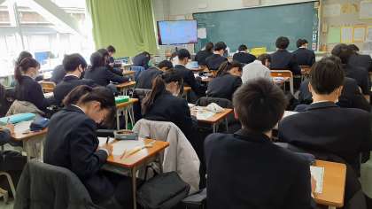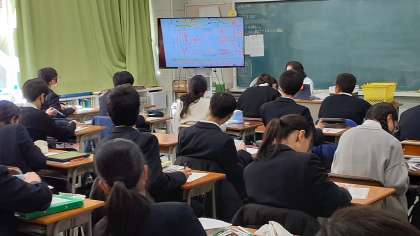 2年生の理科は、「高気圧と低気圧の空気の動きと天気」について学習しています。モニターを使って授業を進めています。