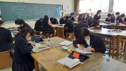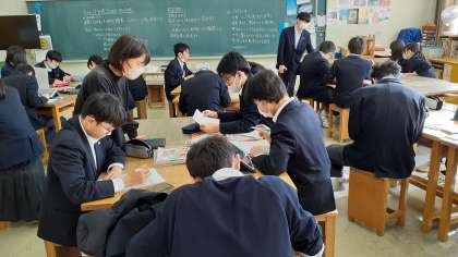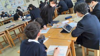 2年生の美術では、「浮世絵パロディ」の制作をしています。それぞれが選んだ浮世絵を元にパロディを考えて作品にしていきます。