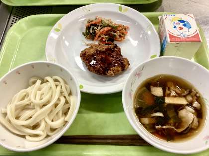 今日は五目うどんです。「かつおの厚削り節」からダシをとっていたのですが、とてもいい香りが給食室中に広がっていました。イタリアンや中華料理のにんにくの香りに負けないくらい、食欲をそそります。具は豚肉・人参・大根・椎茸・ねぎ・小松菜・油揚げです。素材の味とダシの風味、醤油ベースの味付けがうどんを啜る(すする)と同時に口の中に広がり、とても美味しかったです!