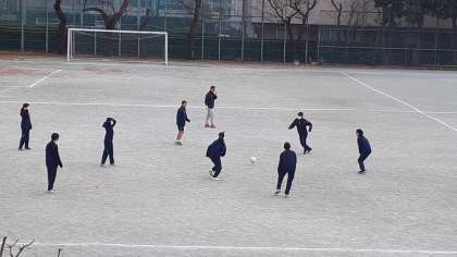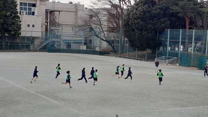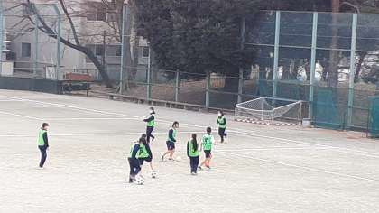 2年生の体育、女子は校庭でサッカーです。2チームに分かれて、ミニゲームをしています。