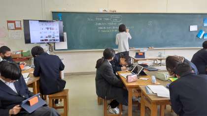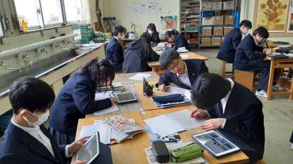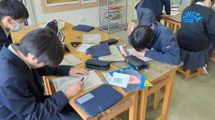2年生の美術は、「浮世絵パロディ」の制作をしています。モニターで2年前の作品を映して参考にしながら、自分のパロディのもととなる作品を決めて、トレースして作品を制作していきます。