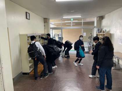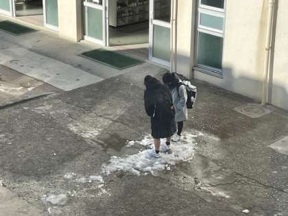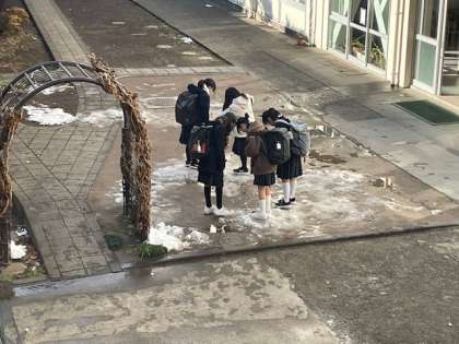 委員会活動のない生徒は下校となります。中庭に残る雪で少し遊んでから帰ります!