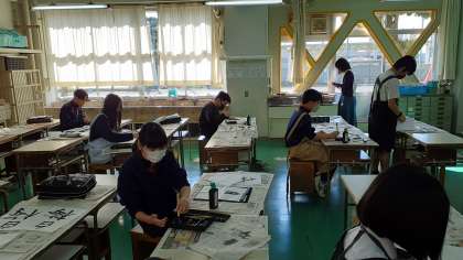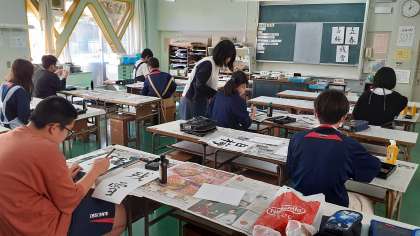 I組の書写の授業です。2月になって、春らしい季節の言葉を書いています。「立春」、「白梅」、「残雪」の中から、それぞれが選んで書いています。