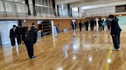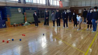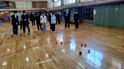 ボッチャのコート4面で、試合をするグループ、審判のグループを順に回しながら何回か試合をしていきます。3人ずつの選手が赤と青の持ち玉を投げて、最後に白い玉に一番近い玉を置いたチームが勝ちになります。投げる順や勝敗を審判が決めていきます。