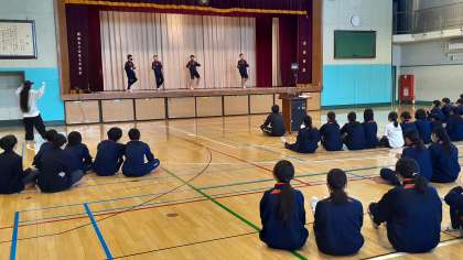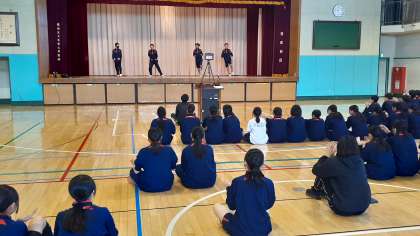 1年生の体育は男女一緒にダンスをしてきましたが、最終回の今日は、グループごとにステージで発表をしています。各クラス男女2グループずつの4グループ、2クラス合同で8グループが順に発表します。振り付けは講師の先生に習ったものをもとに、各グループ、アレンジして練習してきました。