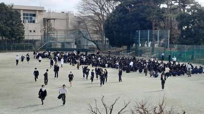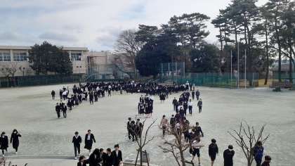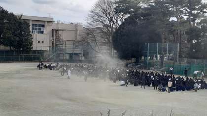 クラス毎に整列し、点呼、報告が終了後、先生からの講話を聞きます。災害はいつどこで起こるか分かりません。より緊張感をもって素早く行動するように心がけましょう。訓練終了後は、まず環境係が雑巾を用意して、学年ごとに解散しました。