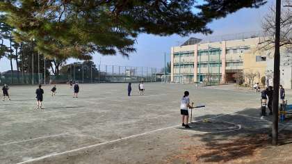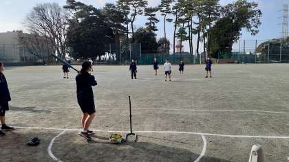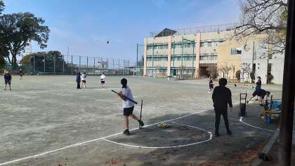1年生体育、女子は、校庭でソフトボールをしています。4グループに分かれて、バッティング練習をしています。