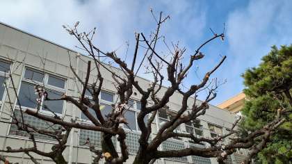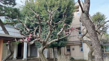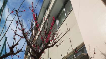 今年は、今月短く剪定をしたばかりなので、わずかに上の方だけですが、中庭の紅梅、白梅ともに、可愛らしい花を咲かせています。中庭を通る時は、上を見上げてみてください。