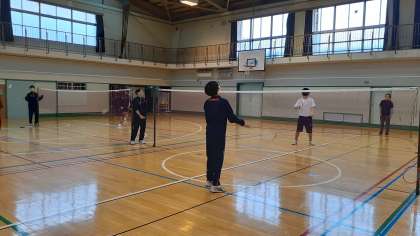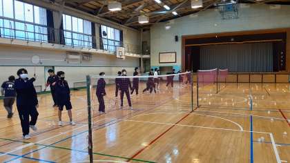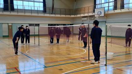 I組の体育の授業は、二つのグループに分かれて、一つは体育館でバドミントンをしています。まず、サーブの練習をして、3つのコートを使って、三点先取のシングルのゲームをしています。審判役も交代で務めます。