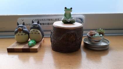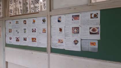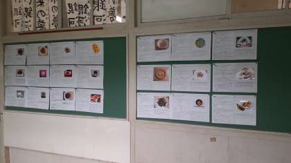 1階のDE組の掲示です。それぞれ工夫した美味しそうなレシピです。1階の廊下には、2年生の先生によるちょっとした癒しのコーナーがあります。