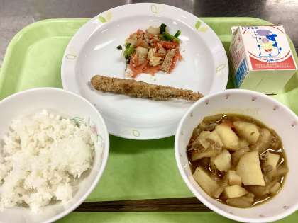 ししゃもフライは今日もサクサク!意外にご飯のおかずとしても合うんです!小魚のいいところは、骨ごと食べられること!牛乳に次いで、カルシウムを補給するのにおすすめの食材です!ただし、注意すべき点は、塩分が少しあることです。そのため、給食ではししゃもが元々もっている塩気を利用し、タレやソース、調味料などは一切使用していません。それでも美味しい!今日もよく噛んで食べてください!