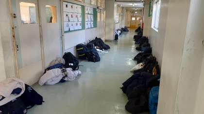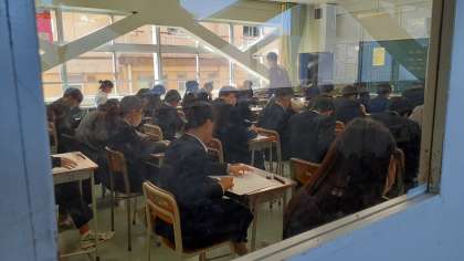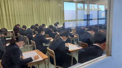 学年末考査、今日の二時間目は英語です。三年生、二年生、一年生の順にリスニング問題を放送していきます。二年生の様子です。三年生はこの後下校となります。