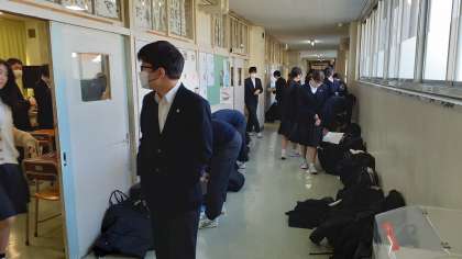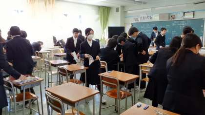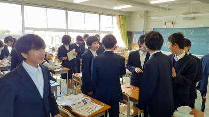 学年末考査二日目、二時間目の理科が終了しました。三年生はこの後下校します。三時間目は美術です。休み時間の一、二年生の様子です。