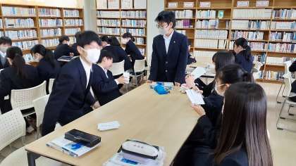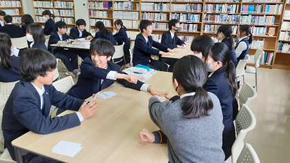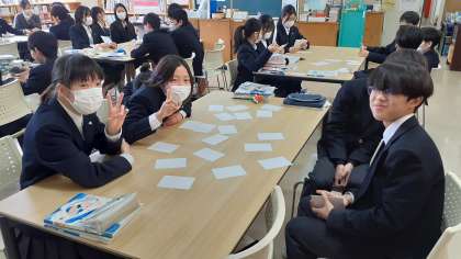 今日の一年生の国語の授業は図書室で行っています。以前に自分たちで作成した故事成語のかるたを使って、グループに分かれてゲームをして、故事成語に親しんでいます。ババ抜きをしているグループや神経衰弱をしているグループがあります。和気あいあいと楽しそうです。
