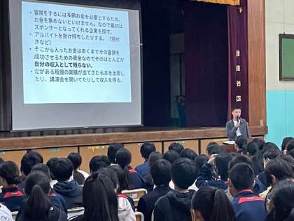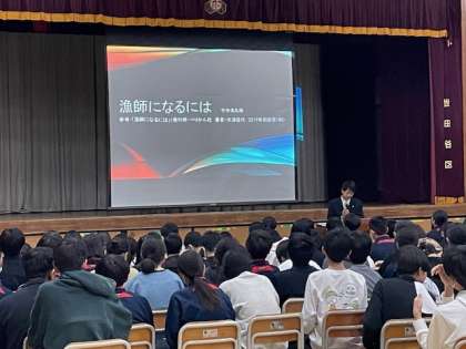 1年生はキャリア教育の職業調べを代表生徒が保護者を迎えて体育館で発表しています。