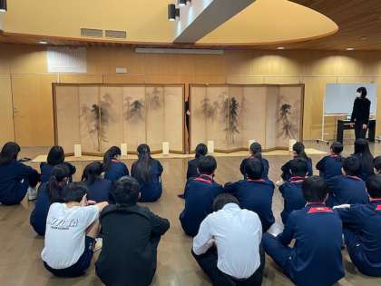 3年生は国立博物館学芸員をお迎えして、国宝松林図屏風長谷川等伯筆の複製を使った鑑賞授業を行っています。