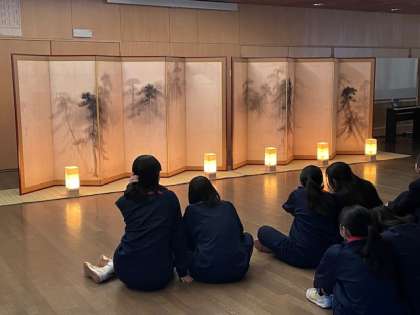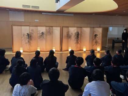当時の蝋燭の光を再現して屏風を鑑賞し、その後蛍光灯との見え方の比較など心に残る見え方の授業となりました。