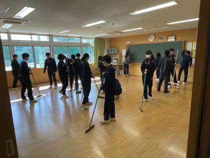 卒業間近の3年生が思い出のクラスに感謝を込めて清掃しています。